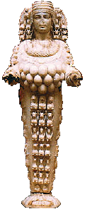 Artemis's role in the birth cycle is referred to in the famous statue at the upper left side of this page, the Artemis of Ephesus, whose multitude of breasts (or, as some art historians would have it, a multitude of eggs, or even, as our textbook mentions, bulls' testicles) indicates her fertility/nature aspects. This particular statue also emphasizes her role as Potnia Theron, the Lady of the Beasts, as you can see in this close-up of the animals carved into her robe.