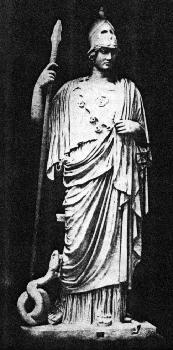 the hairstyle or face. But the statue at right is clearly Athene: even though her helmet is gone, the aegis