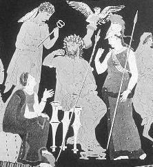 Zeus is also the protector of the city and of hospitality, or xenia. Because there were no hotels in ancient Greece, members of the aristocracy had a system worked out where the members of one family could stay at another's home and enjoy their protection. For that reason, the word xenos meant both "stranger" and "guest," and is sometimes translated as "guest-friend." The host was expected to provide guest-gifts and to feed and house his xenoi--and the descendents of his ancestors' xenoi, since these relationships were inherited--for as long as they were in town. Anyone who violated the law of xenia by mistreating a guest ran the risk of Zeus's wrath. Likewise anyone who broke an oath. In fact, Zeus had two epithets that referred to these functions: Zeus Xenios, as protector of hospitality, and Zeus Horkios, as protector of oaths, as well as the name Zeus Hikesios, which referred to his role as protector of suppliants.